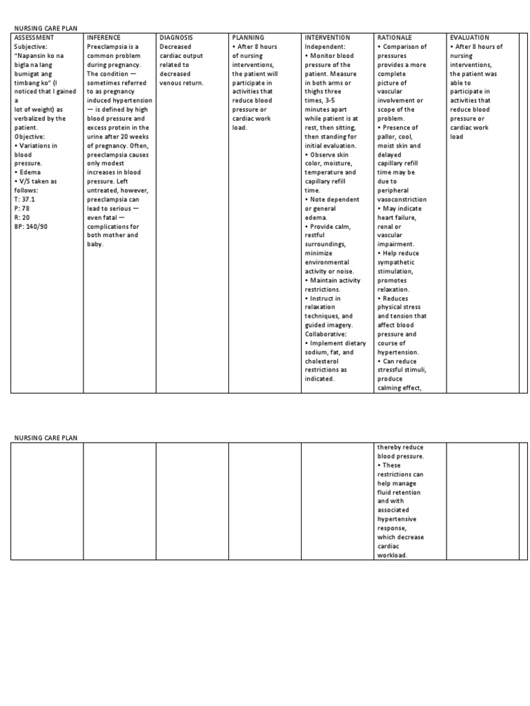 Preeclampsia Care Plan Docx Nursing Care Plan Priority Nursing Goal Outcome Nursing Interventions Rationale Diagnosis Evaluation Course Hero